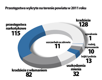 Zatrzymano 254 osoby, w tym do wytrzeźwienia 94 (86 mężczyzn, 6 kobiet i 2 nieletnich), w związku z popełnieniem przestępstwa 109, doprowadzeniem do aresztu, prokuratury i sądu 31. Za popełnione wykroczenia w 2011 roku policjanci represjonowali 13500 sprawców.